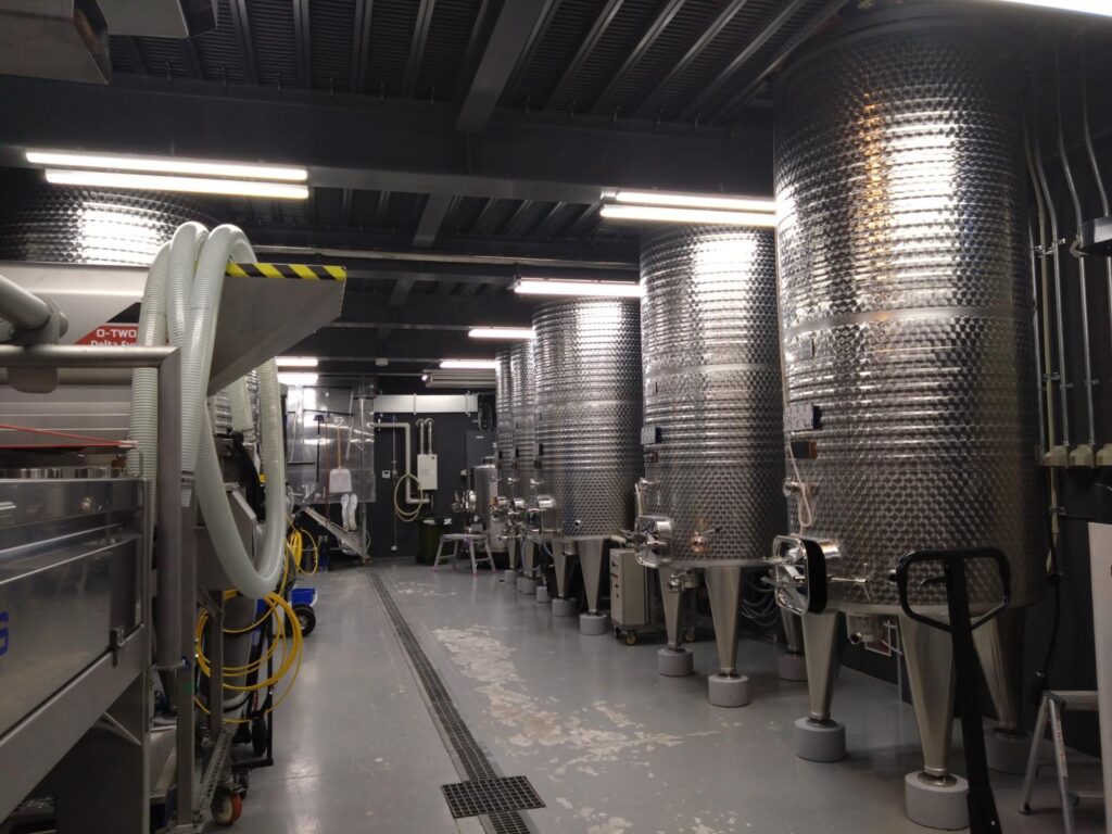 この部屋でブドウを搾り、種類ごとのタンクに分けて酵母を仕込み、10~14日ほど発酵させます。