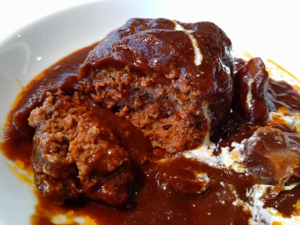 赤ワイン仕込みのハンバーグはつなぎや脂少なめで健やかな食感。肉の旨味が遺憾なく引き出されていました。