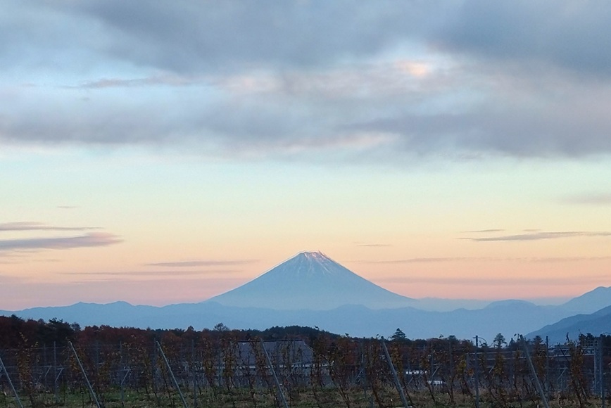 最後はブドウ畑へ。夕闇迫る富士山が幻想的です。