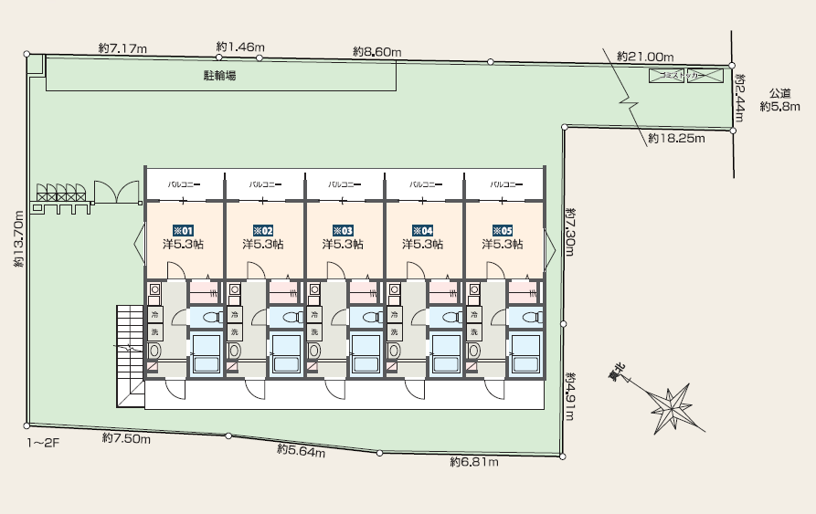 全戸とも専有面積は19.51㎡。間取りは1Kタイプで、気密性とプライバシーに配慮。