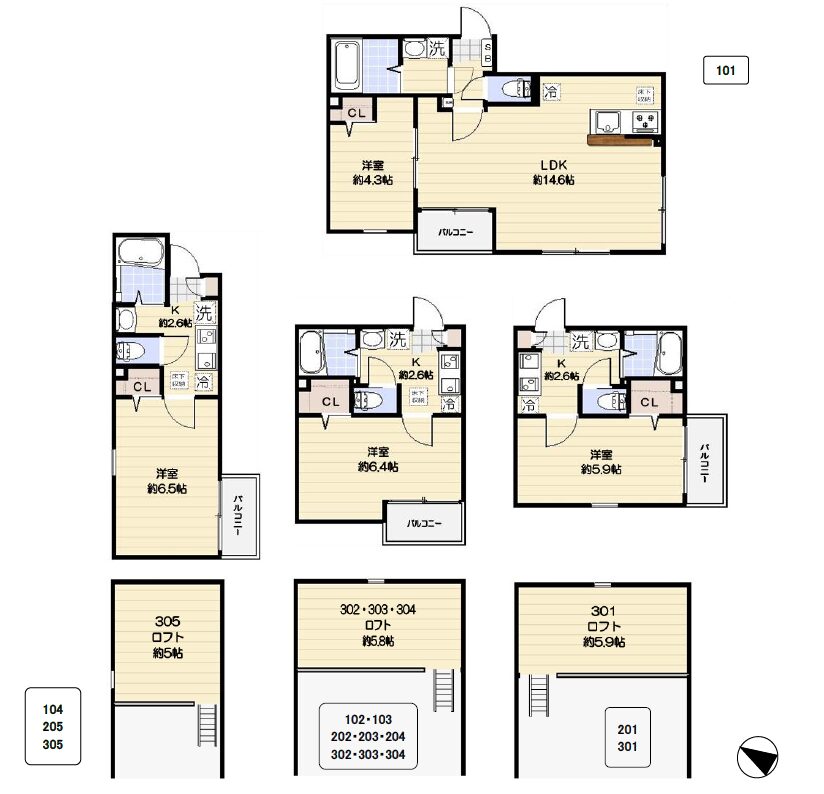 全戸とも間取りは1K以上で、専有面積20㎡台が中心。